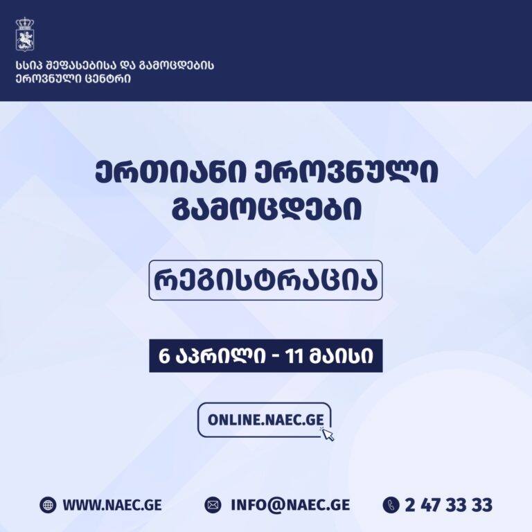 ????დეტალური ინფორმაცია რეგისტრაციის პროცესთან დაკავშირებული სხვა საკითხების შესახებ შეფასებისა და გამოცდების ეროვნული ცენტრის ოფიციალურ ვებგვერდსა და სოციალურ ქსელში გამოქვეყნდება.
